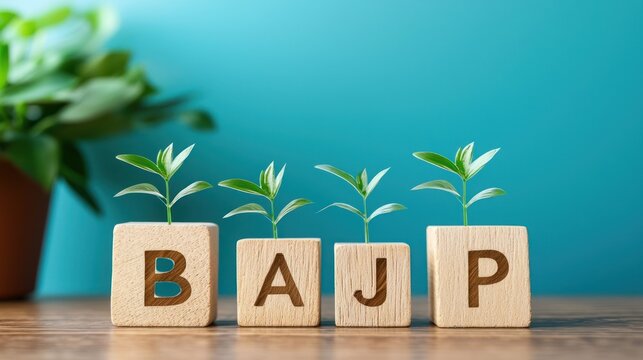 Four wooden blocks with the letters B, A, J, P, and a plant growing on them.