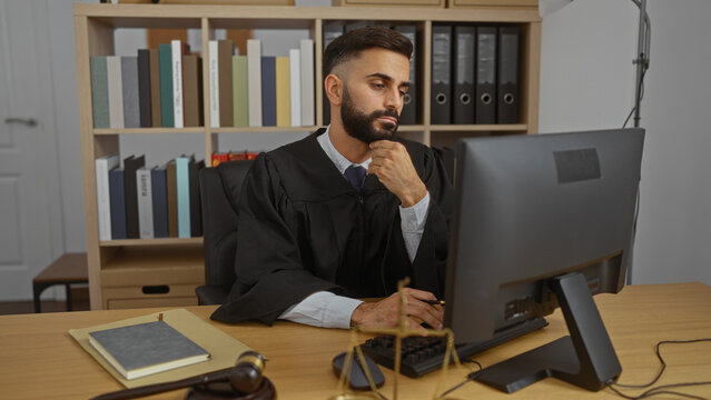 Young hispanic man in judge robe working at computer in office with bookshelf in background and writing utensils on desk