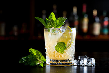 Two cocktails Mint Julep on a bar counter. Horizontal shot
