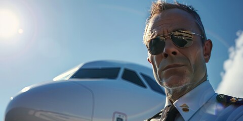 pilot standing in front of commercial airliner jumbo jet