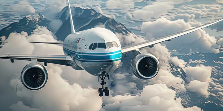 commercial airplane, white with blue and green color scheme, flying in the sky,