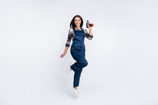 Full size photo of happy smiling lovely pretty woman builder constructor jumping with drill isolated on white color background