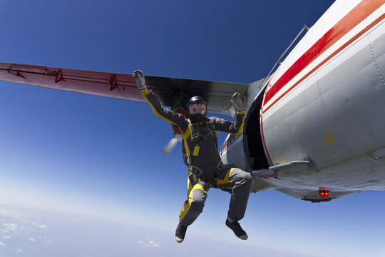 two parachutists jumping out of an airplane in free style