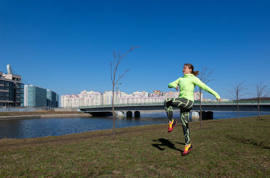 1 white young woman doing workout outside in city by river, girl jumping