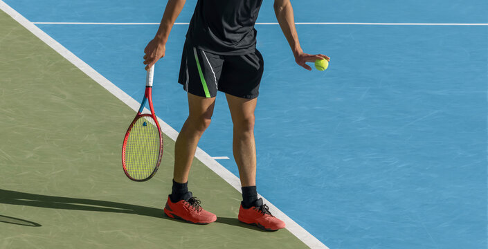 Young tennis player playing tennis on blue hard court. Male athlete with ball and racket is ready to serve at start of game. Sports background, copy space