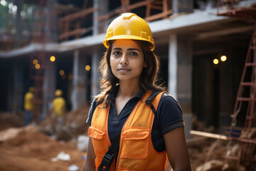 Female site engineer surveyor working with theodolite total station EDM equipment on a building construction site outdoors