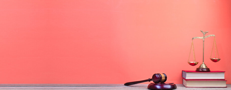 Law and justice is represented by a mallet gavel of the judge, scales of justice, and books. There is