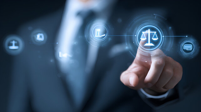 Legal advice business concept, lawyer consulting on business rules labor law and corporate regulations represented by attorney at law using virtual screen icons of justice law and policy compliance
