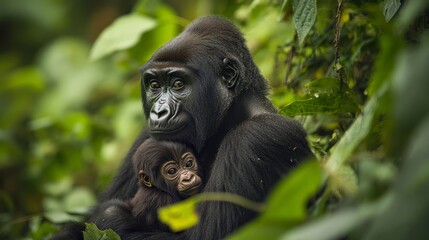 Adult female gorilla with baby Gorilla beringei beringei in the lush foliage of the Bwindi Impenetrable forest Uganda. Members of the Muyambi family habituated group of the conservation programme.