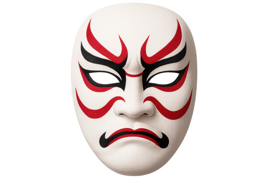 A colorful kabuki theater mask, bold red and black face paint design on white base, highly detailed, isolated on transparent background