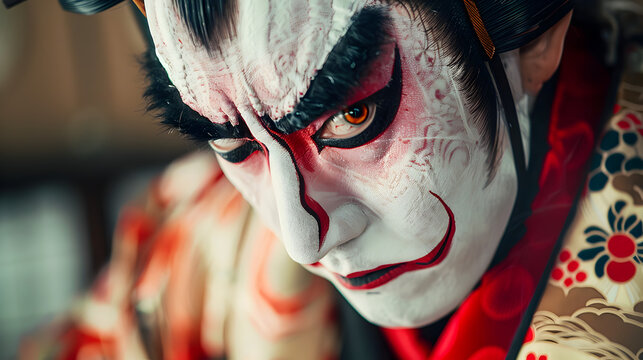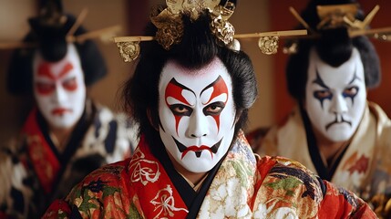 Kabuki Theater Performance: A dramatic Kabuki theater performance with actors in elaborate costumes and makeup.