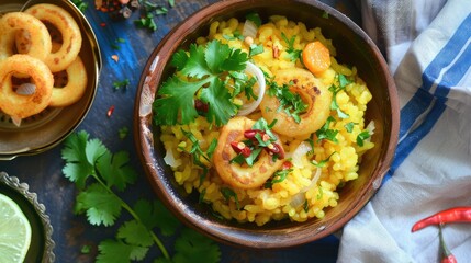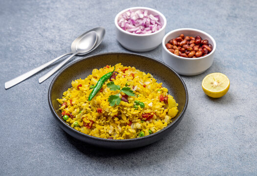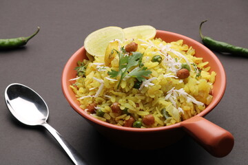 Kande Pohay OR Aloo Pohe is a popular Indian breakfast recipe made using Flattened rice, usually served with hot tea. Served in a bowl over moody background. Selective focus