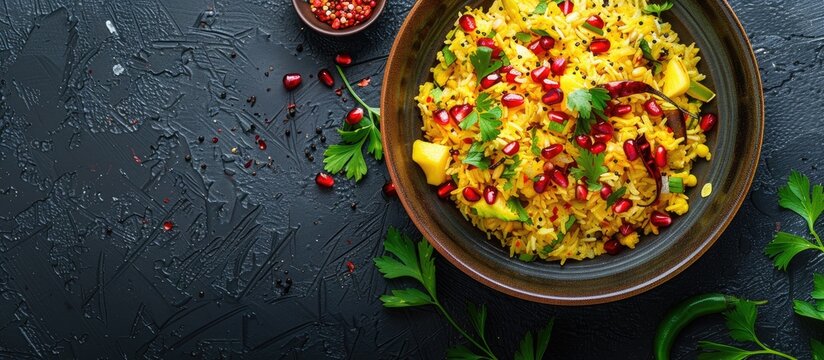 Enhance your Indian breakfast Poha with colorful toppings like pomegranate seeds green chili coriander and curry leaves for a visually appealing dish with copy space image