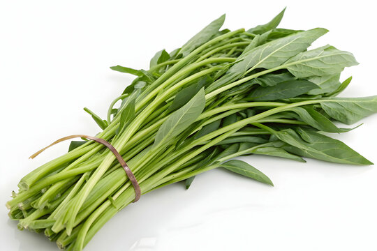 Fresh Organic Water Spinach Kangkong Bunch with Water Droplets Isolated on White Background