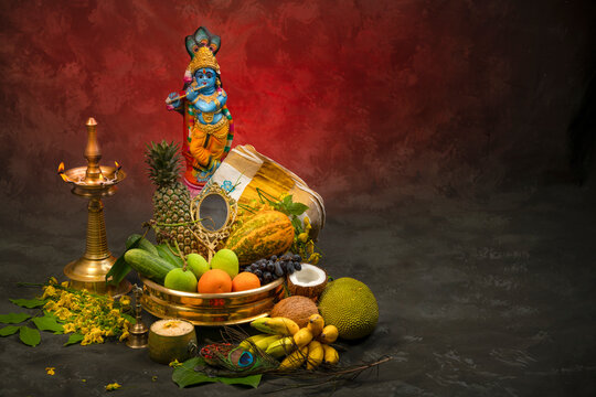Vishu kani image, Beautiful Kerala festival special Vishukkani background, lord krisha and konna poov with fruits and vegetables
