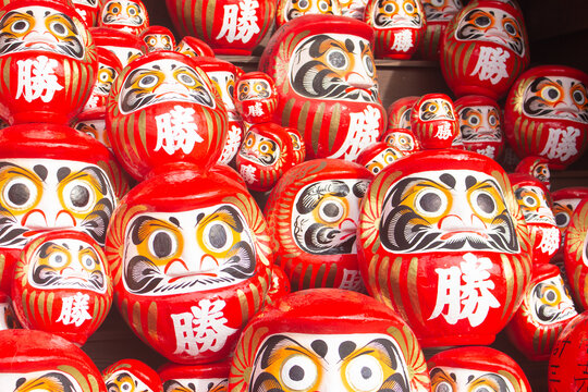 Daruma dolls in Katsuoji Temple. The Kanji translated to English: 'Victory'.