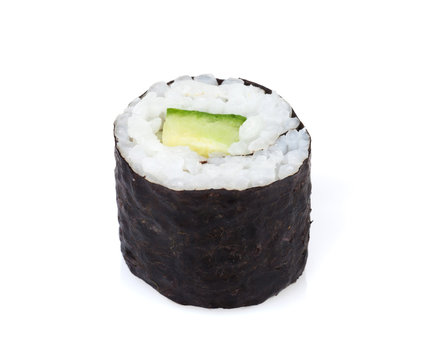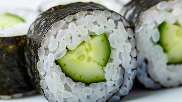 Extreme close up of kappa maki sushi showing cucumber wrapped in rice and nori, emphasizing freshness, texture, and traditional Japanese simplicity.