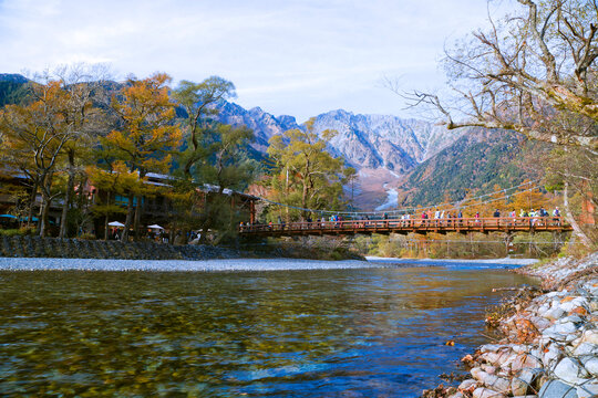 Tourists on the kappa wooden bridge at Kamikochi National park, the northern part of the Japan Alps in Chubu region.