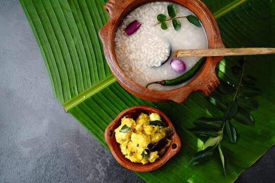 Kanji and Kappa- traditional kerala comfort food porridge with yucca, selective focus