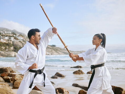 Celebrating Achievement: Joyful and Energetic Karate Couple in Uniforms, Embracing Togetherness, Confidence, and the Harmonious Spirit of Martial Arts