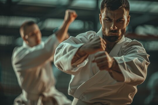 Two individuals dressed in white karate uniforms are training in a spacious dojo. They are focused and in a strong, practiced stance, ready for a sparring session.