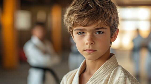 Male athlete training in martial arts at a dojo for self defense and sports competitions