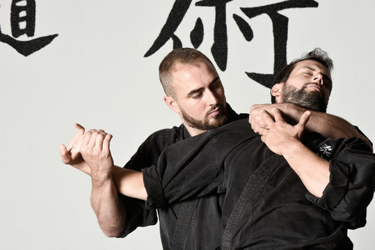 Two fighters of martial art (Ju-Jitsu) with black kimono and black belts
