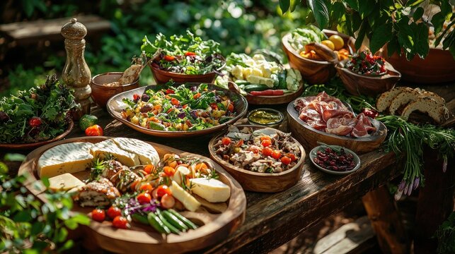 A lavish spread of zero-carbohydrate gourmet dishes elegantly presented on a rustic wooden table, amidst a lush green garden. Each dishshowcases the art of low-carb living