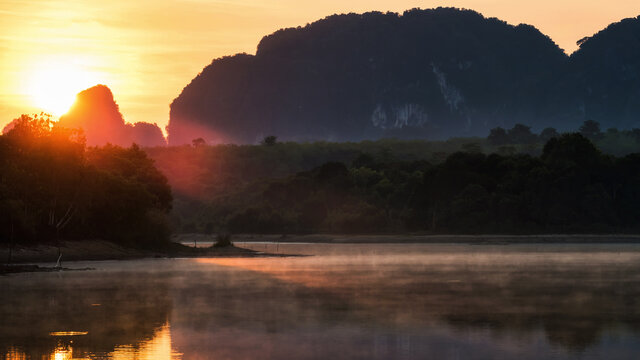 beautiful reservoir and karst mountain at sunrise