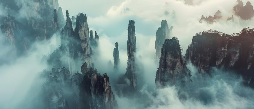 Aerial view of the towering karst pillars pierce the sky, their rocky surfaces softened by clinging greenery in Zhangjiajie National Forest Park, Hunan, China.