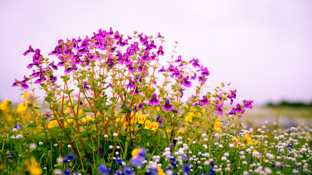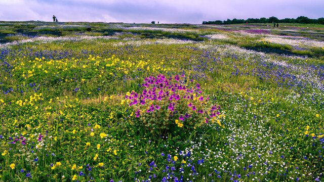 Kas pathar, plateau. In monsoon, these colorful flowers only blossom once in a year in soil gathered in rocks of a mountain after monsoon is over. Satara near Pune, Maharashtra, India.