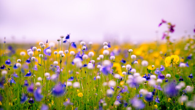 field of flowers, Kas pathar, plateau. In monsoon, these colorful flowers only blossom once in a year in soil gathered in rocks of a mountain after monsoon is over. Satara near Pune, Maharashtra, Indi