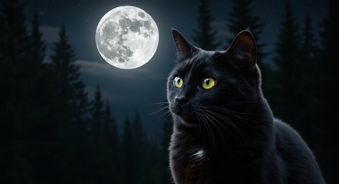 Zwarte kat kijkt mysterieus maanlicht bosnacht aan. AI Generated