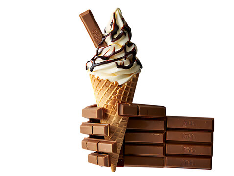 Png delicious vanilla ice cream cone with chocolate drizzle and kit kat bars isolated on transparent background, a perfect treat for a hot summer day transparent background