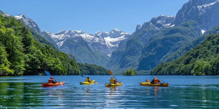 Tranquil Kayaking Adventure: People Enjoying Serene Lake Amidst Majestic Mountains
