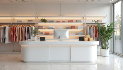 Modern clothing store with white cashier desk, racks of apparel. Shelves hold folded garments. Computer, laptops on counter, plant decorates space. Floor tiles gleam reflecting bright interior