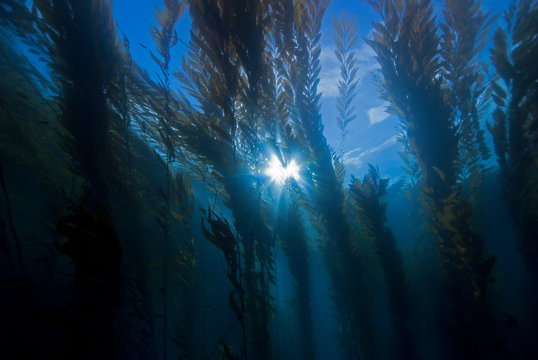 Giant kelp forest canopy in California Current upwelling: sunlight shafts, garibaldi fish, sea otter tool use, strawberry anemones in Gates-housed