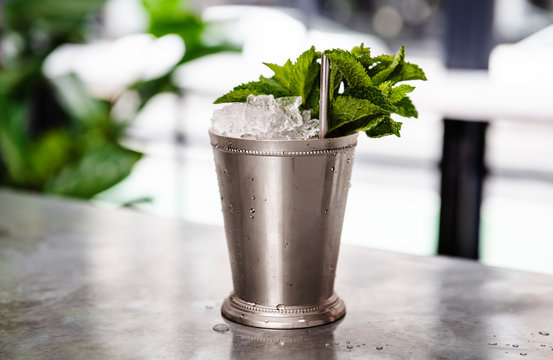 Mint julep drinks in silver cups with red roses and horse silhouette in background
