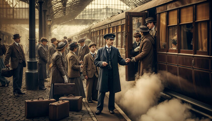 Steam Train Conductor Helping Passengers Board at Bustling Station, Early 20th Century Vintage Travel Scene