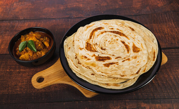 Kerala paratha / parotta, layered flat bread made from maida or whole wheat flour. Served with spicy kerala chicken curry, isolated over a rustic wooden table, selective focus