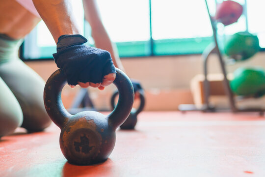 Kettlebell on the red floor held in hand of athlete in blurry at the background.
