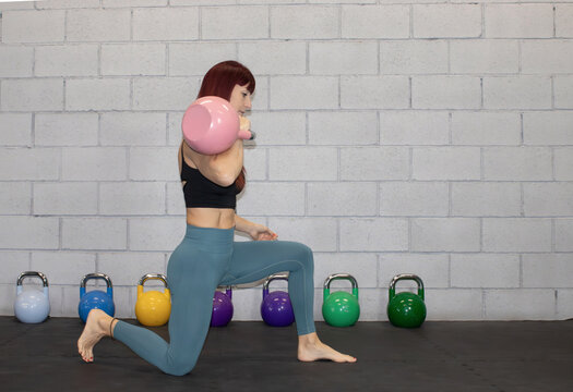Fitness woman doing lunges exercises with kettlebell, leg muscle training. Active girl doing front forward one leg step lunge