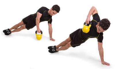 Performing side plank row with kettlebell fitness client in studio gym, trainer guiding on tablet