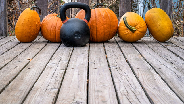 heavy iron kettlebell with a crop of pumpkins on a wooden deck, fall holidays and fitness concept