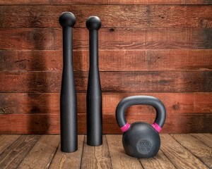 pair of heavy steel Indian clubs and a small iron kettlebell against rustic, weathered wood background - functional fitness concept