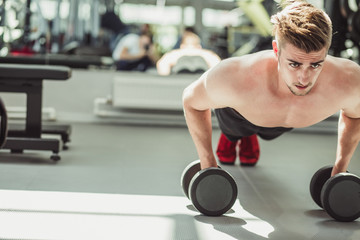 Push ups sport, hald-naked fitness man doing push-ups in gym. Male athlete exercising push up during crossfit workout. Sport, Leisure and Healthy lifestyle concept.