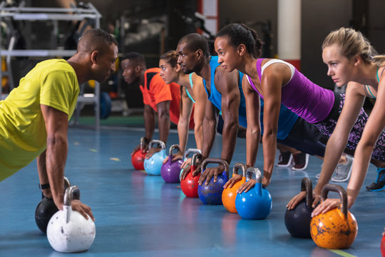 Kettlebell Push-Up: Athletic Man Exercising in Gym
