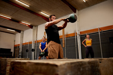 Diverse training with kettlebells in industrial gym