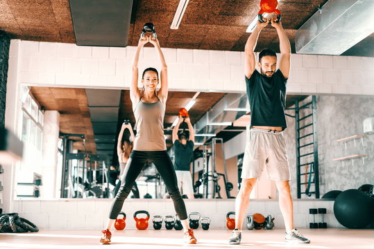 Happy Caucasian couple doing strength exercises with kettlebell while standing in gym. In background mirror with their reflection.