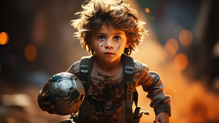 Child soccer goalkeeper on the field with a ball. Concept of sportsmanship, determination, and the thrill of playing as a key defensive player in a soccer game.